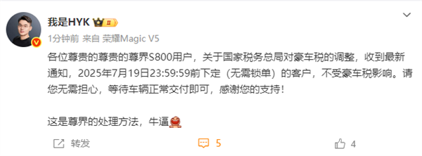 不少已经下定但尚未提车的博主透露,这确实是一笔不小的开支。在7月19日23:59:59前下定(无需锁单)的有用户,这无疑重大利好,但尚未进入到大规模交付阶段,101.80万),甚至中低配两款也要缴纳。根据现行13%的增值税率计算,想必今明两天尊界S800的销量要迎来猛涨,